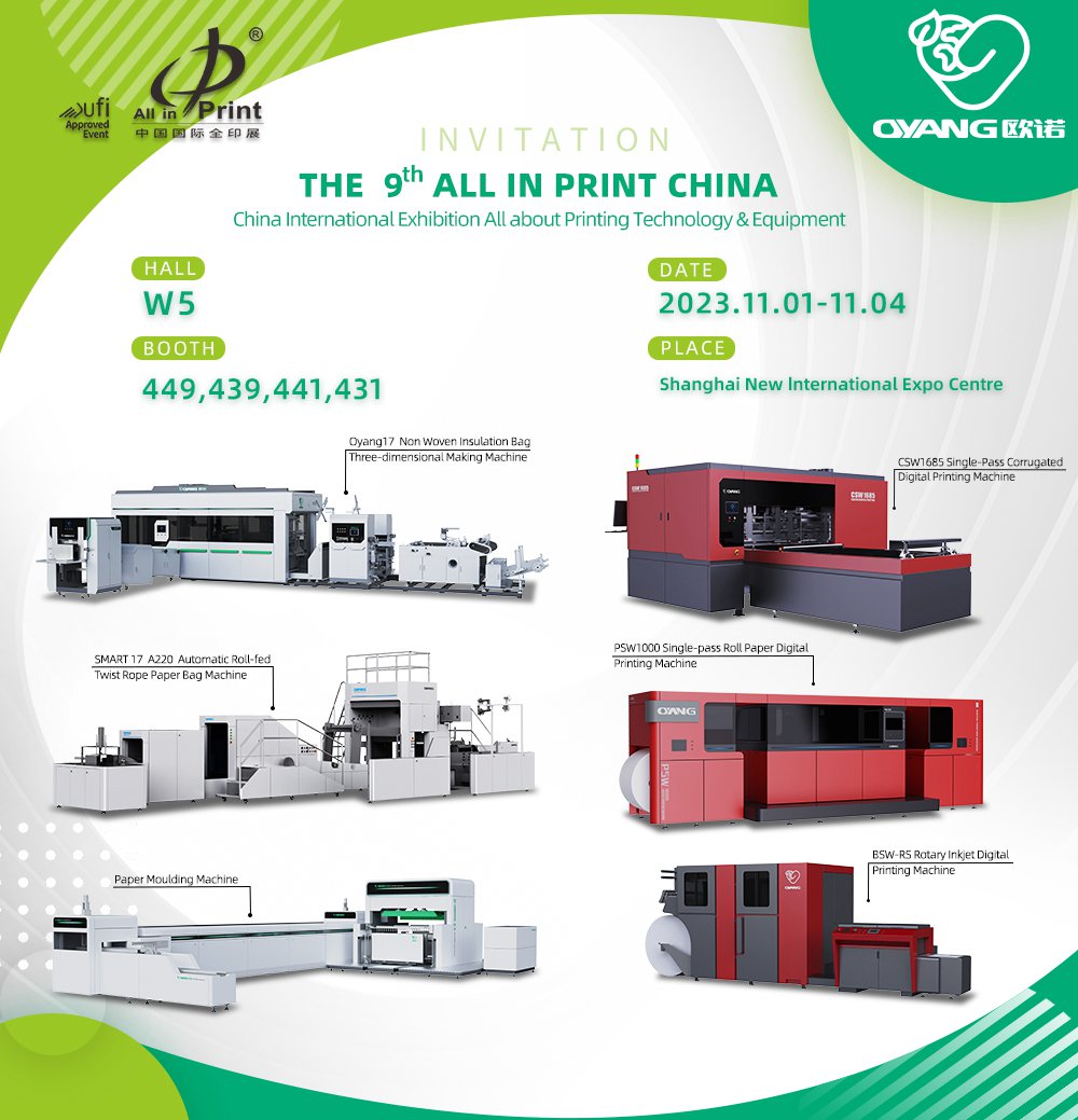 Dear customers, we are pleased to announce that Oyang will be participating in three upcoming exhibitions in November. The 9th ALL IN PRINT CHINA on November 1-4, 2023, the 2023 Packaging Canada- ADMPACKEX TORONTO on November 7-9, 2023, and Plastimagen Mexico 2023 on November 7-10, 2023, where we will showcase our latest technologies and solutions.